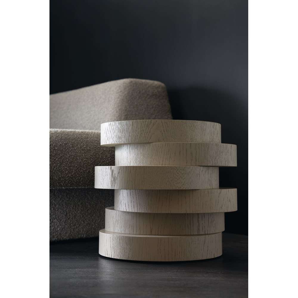 An exercise in equilibrium, the Rona side table brings a note of playfulness to living interiors. A series of stacked discs create depth and dimension, crafted in open-grain oak veneers and a neutral Fossil finish. Organic and intentional, Rona?s versatile form balances clean modern lines and flows seamlessly with curves.