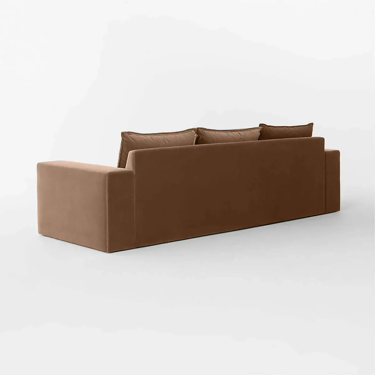 Vintage-inspired sofa, upholstered in a plush cotton/poly blend velvet. Wraparound arms add architectural interest while three loose back cushions keep it comfortable