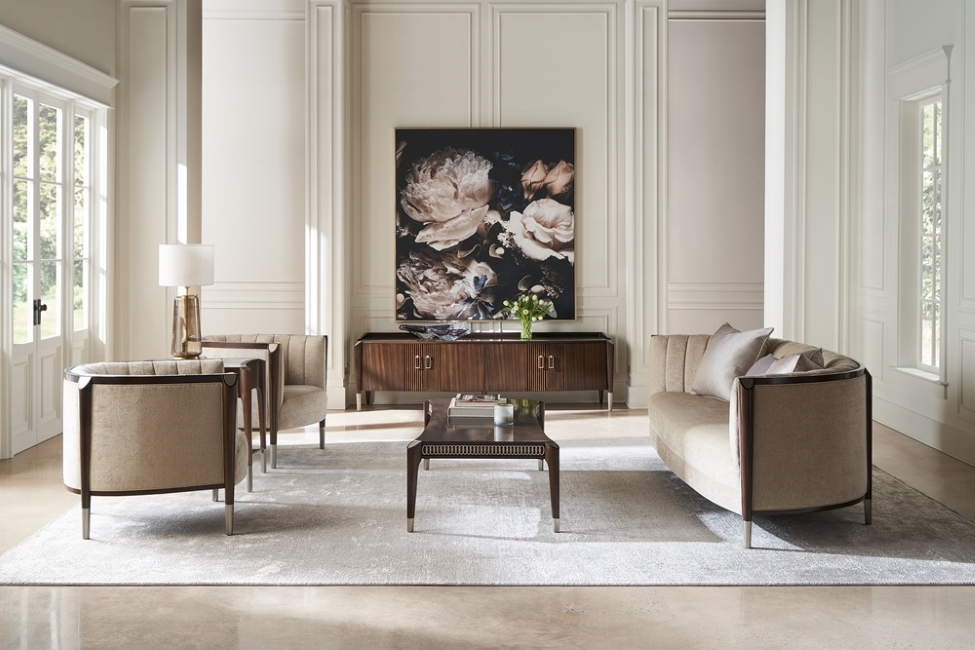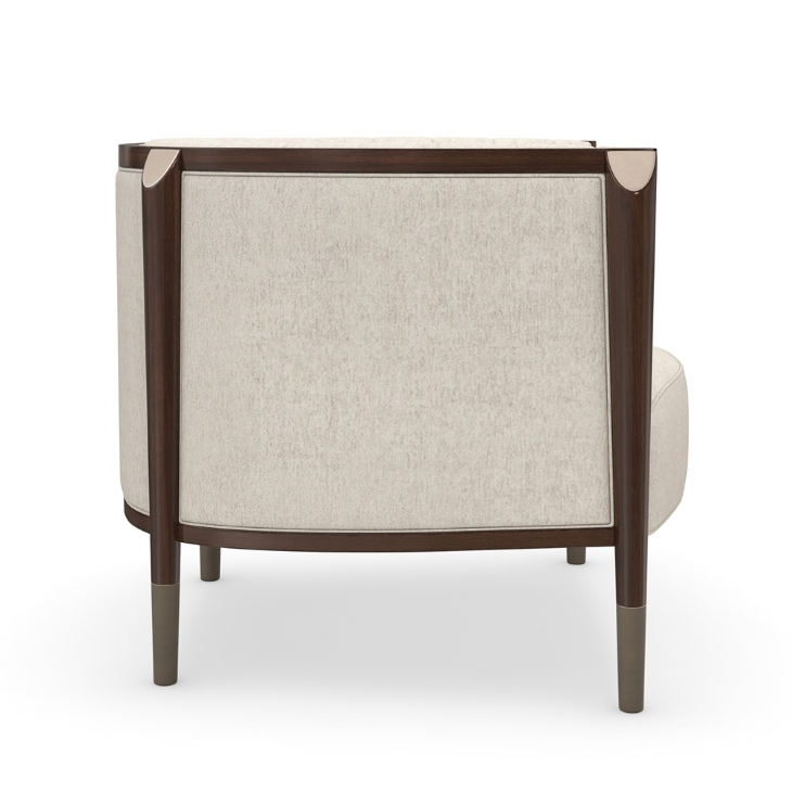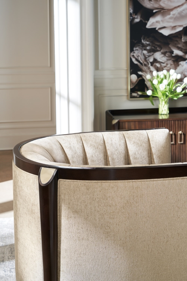 A tight seat construction and vertical channel tufting reinforce the refinement of Oxford?s classic silhouette, dramatically defined by an exposed wood frame and tall conical legs with Pyrite-painted ferrules and silkscreened top medallions. Dressed in a softly contrasting, bronze micro-chenille fabric and accented with a satin pillow, Oxford introduces a look of enduring luxury.