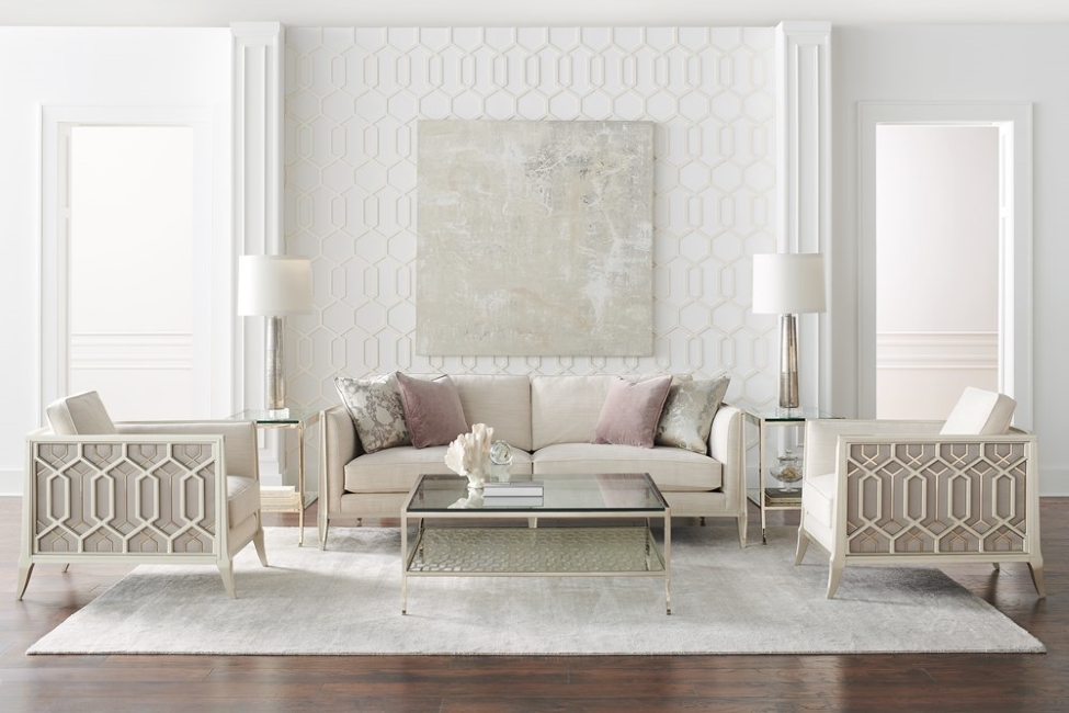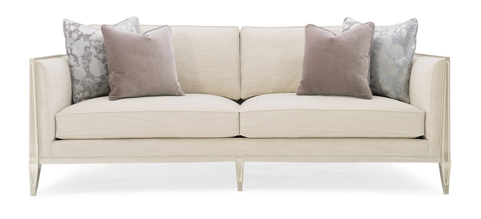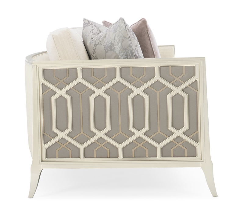Every time you see the Just Duet sofa, you?ll remember the remarkable story behind its design inspiration. Its sumptuous seating area is bordered by a one-of-a-kind wood frame featuring carvings inspired by the patterns of a palace balcony railing in India. The layering of metal fretwork behind the wood was inspired by the dual shadow cast on the balcony by the setting sun as seen through the railing?s design. Creating a high fashion look unique to itself, these elements are highlighted with illuminating shades of Soft Silver Paint and Champagne Gold. Exquisite fabrics and touchably luxe accent pillows complete its appeal.